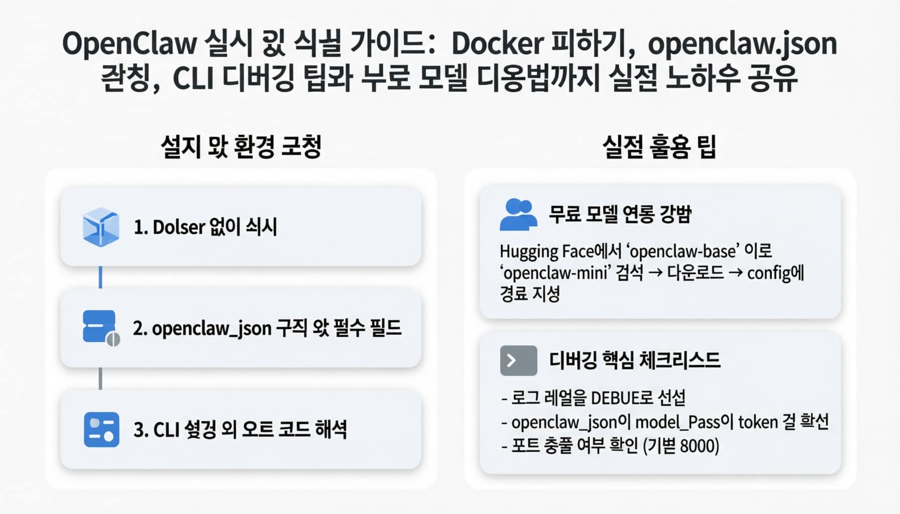 OpenClaw 설치 및 설정 가이드: Docker 피하기, openclaw.json 구성, CLI 디버깅 팁과 무료 모델 사용법까지 실전 노하우 공유