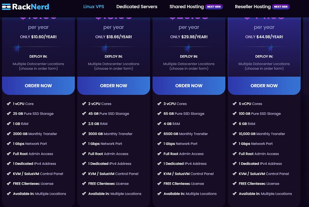 RN의 현재 데이터 센터 배포 + 테스트 IP: 뉴욕(테스트 IP: 192.3.81.8) 시카고, IL(테스트 IP: 198.23.228.15) 댈러스, TX(테스트 IP: 198.23.249.100) 시애틀(테스트 IP: 192.3.253.2), 샌호세, CA(테스트 IP: 192.210.207.88), 애쉬번(테스트 IP: 107.173.166.10), 로스앤젤레스 DC02(테스트 IP: 204.13.154.3), 로스앤젤레스 DC-03(테스트 IP: 107.174.51.158), 토론토, 캐나다(테스트 IP: 167.160.186.8) 스트라스부르, 프랑스(테스트 IP: 45.95.173.2). 5.99달러가 추가로 필요합니다. 아래는 이용 가능한 서버의 최신 블랙 프라이데이 특별 혜택입니다. 구매 시 경품 당첨 기회도 제공됩니다! 1GB RAM, 1 CPU 코어, 25GB SSD 스토리지, 2000GB 트래픽/월 1Gbps 대역폭, 1 IPv4 주소 $10.60/년(갱신 가격 동일) 구매 링크: https://my.racknerd.com/aff.php?aff=1900&pid=923 2.5GB RAM, 2 CPU 코어, 45GB SSD 스토리지, 월 3000GB 트래픽, 1Gbps 대역폭, 1 IPv4 주소 $18.66/년(갱신 가격 동일) 사용 가능한 데이터 센터: 여러 데이터 센터 사용 가능 구매 링크: https://my.racknerd.com/aff.php?aff=1900&pid=924 4GB RAM, 3 CPU 코어, 65GB SSD 스토리지, 월 6500GB 트래픽, 1Gbps , 1 IPv4 주소 $29.98/년(갱신 가격 동일) 사용 가능한 데이터 센터: 여러 데이터 센터 사용 가능 구매 링크: https://my.racknerd.com/aff.php?aff=1900&pid=925 6GB RAM, 5개 CPU 코어, 100GB SSD, 10,000GB 트래픽/월 1Gbps 대역폭, IPv4 주소 1개, 연간 $44.98 (갱신 시 동일 가격). 여러 데이터 센터 이용 가능. 구매 링크: https://my.racknerd.com/aff.php?aff=1900&pid=926 8GB RAM, 6개 CPU 코어 150GB SSD, 20,000GB 트래픽/ 월 1Gbps 대역폭, IPv4 주소 1개, 연간 $62.49 (갱신 시 동일 가격). 여러 데이터 센터 이용 가능. 구매 링크: https://my.racknerd.com/aff.php?aff=1900&pid=927 |