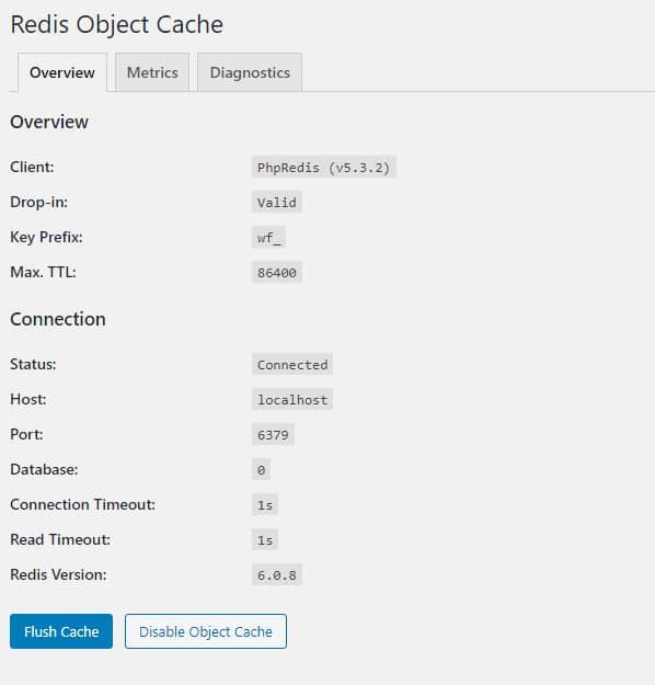 enable object cache 눌러 redis 적용.